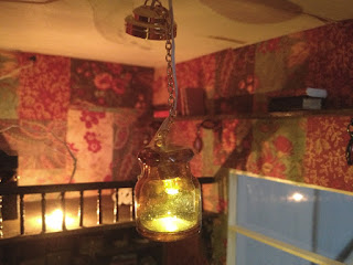 Alunperin halusin ostaa lasikupuja, mutta "jouduin" ostamaan myös paljon muuta. Pikkuhuoneeseen tuli uusi kahden istuttava tuoli (huutaa tuunausta), lasikupu ja pari led-lamppua. Jotenkin onnistuin tyrimään kattolampun valinnassa = sen valo on sitä kylmää ja häijyä valoa. Vaan eipä hätää, kattolampppu muuntui lasipurkiksi irroittamalla kupu ja kääntämällä se ylösalaisin. Purnukan pohjassa on reikä, josta sain purkkiin lasihelmiä täytteeksi ja reikä oli juuri sen kokoinen, että sen sai tukittua nastalla.